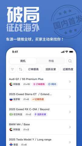 车出海是一款专为汽车出口行业设计的移动软件,为二手车商和国际买家提供高效便捷的交易解决方案。通过软件,轻松管理库存、优化销售流程,甚至直接在手机上浏览和购买心仪的汽车。无论是国内的二手车商,还是希望在国际市场上寻找合适车辆的买家,都能够在这里找到理想的服务,提升汽车交易的效率。
