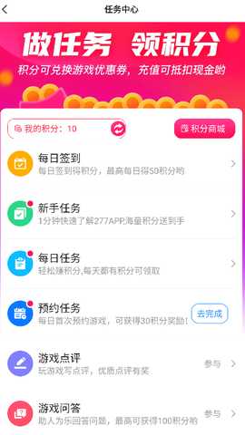 3、完成游戏平台发布的任务可以领积分,领取到的积分可兑换游戏优惠券,充值可抵扣现金。