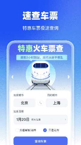 特惠火车票查是一款专为出行用户设计的软件,为旅客提供快速、便捷的火车票查询服务。通过软件,轻松查找全国范围内的高铁和火车票信息,帮助用户节省时间和精力。软件还具备智能行程管理功能,助您轻松规划和保存旅行安排,确保每一次出行都能顺利进行。无论是商务出行还是休闲旅游,软件都能为您提供实用的支持,提升旅行体验。