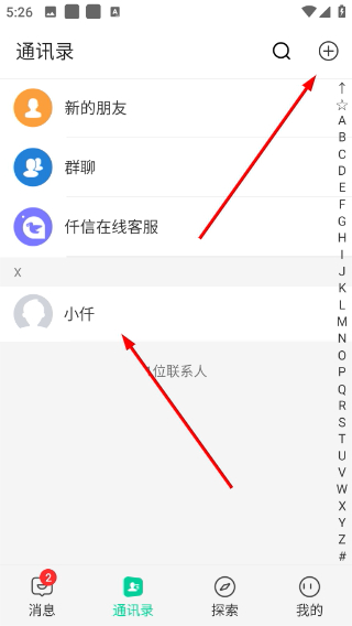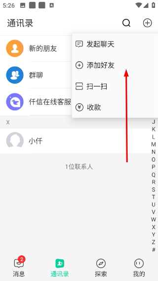 1. 打开仟信的通讯录页面,可以查看已有联系人,也可点击右上角的加号展开更多功能选项。