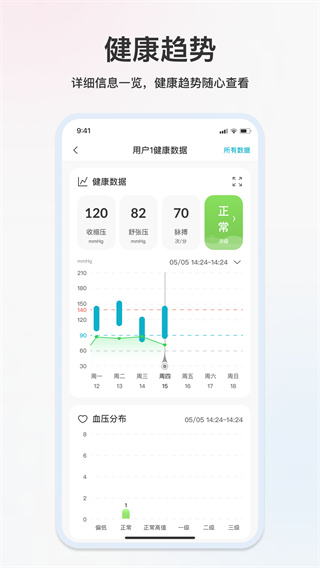 趋势分析:以图表形式展现血压和心率的变化趋势,帮助用户直观了解健康状况。