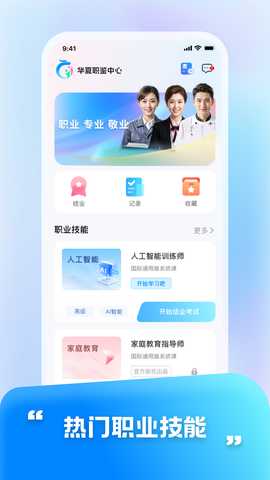 华夏东方职业技能鉴定中心位于首都北京,平台专注为各行各业的职业人才提供专业的技能培训和就业指导;为职业人才的发展赋予优良的职业形象。软件帮助用户提升职业技能,增强就业竞争力,为用户提供全面的职业发展支持。
