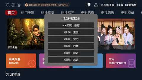 1、下载并安装K影院新版2023应用后,打开应用,您将看到首页推荐的热门影视内容。