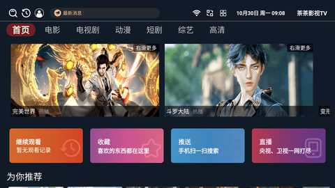 1、下载并安装茶茶影视TV应用,打开软件后,用户会看到主界面上的影视分类选项。
