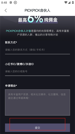 依次输入联系方式、小红书ID、微博ID、抖音ID,最后撰写申请理由,点击提交申请。