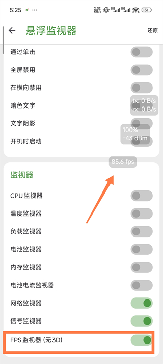 启用帧率显示:在监视器界面找到【帧率(FPS)】选项,点击开关按钮即可在屏幕顶部显示实时帧率数据。