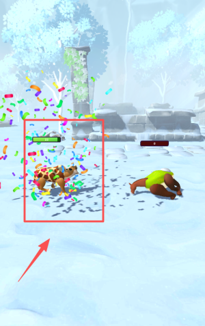 进入对战场景后,点击下方红色箭头指向的胜利兽;或者观察左侧雪地里失败的兽以及飘落的五彩纸屑。