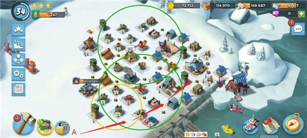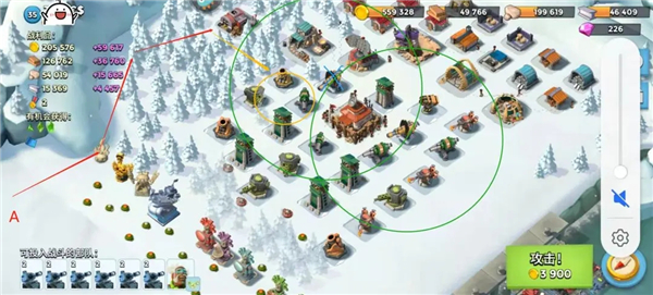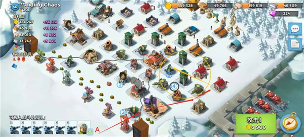 (2)如图,在A点位置登陆(尽可能靠边登陆)按照红线路线向前推进,黄圈内的防御建筑都要推掉,如果被两个小加集火攻击的话可以丢震爆,如果一个小加打一个坦克的话能量能省则省。