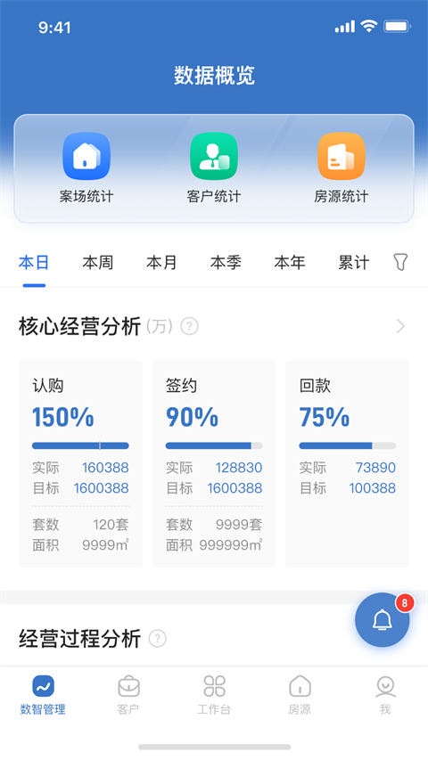 1、数智管理:包含案场统计、客户统计和房源统计等数据概览功能,以及核心经营分析功能模块;