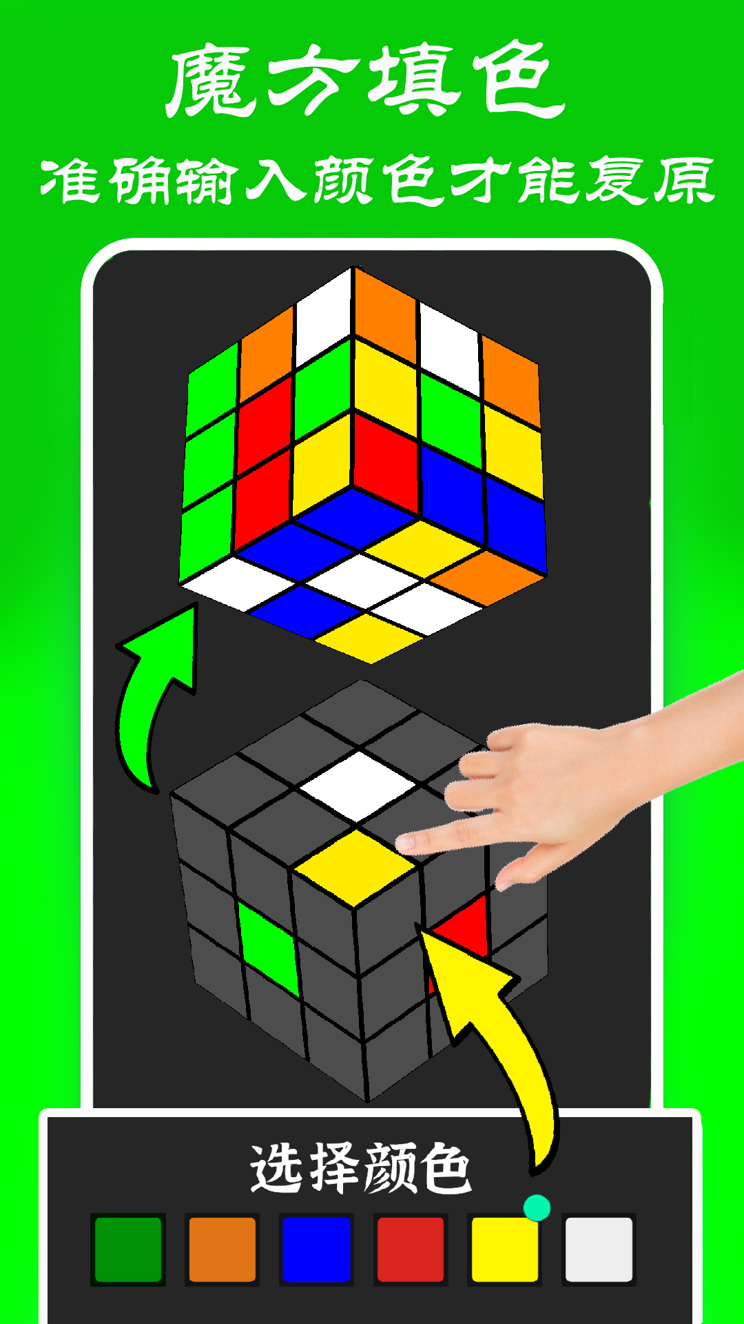 通过3D控制旋转魔方,根据需要还原的图案进行颜色填充,操作简单直观。