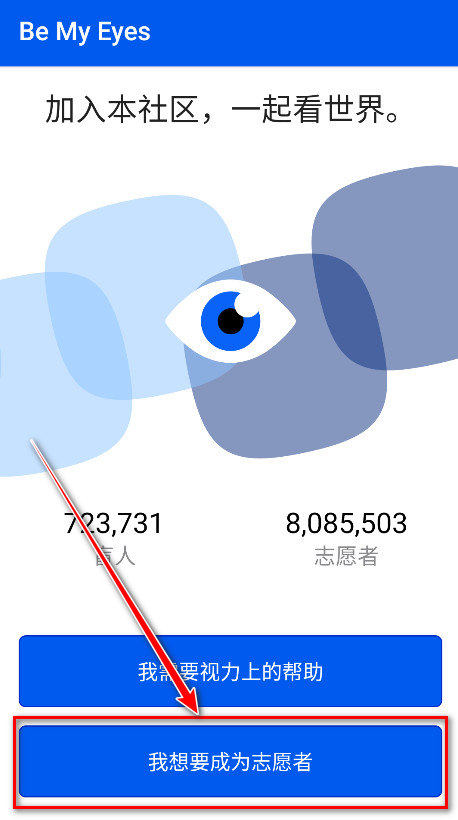 1.打开be my eyes,点击我想要成为志愿者。
