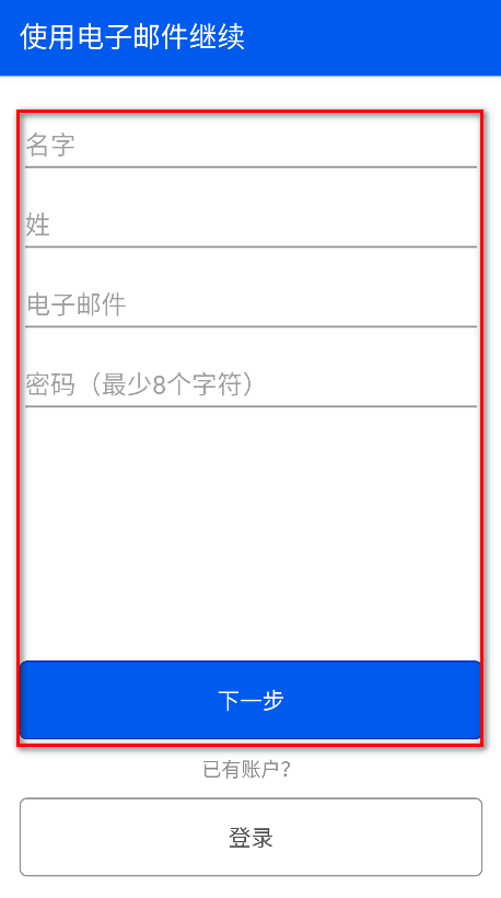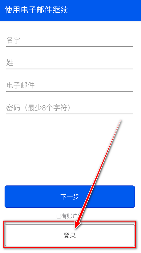 4.输入自己的名、姓、电子邮件、密码,然后点击下一步。