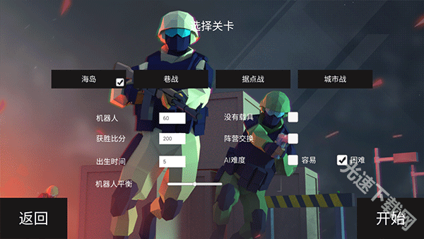 接着选择关卡地图,设置获胜比分、角色出生时间、游戏难度等参数,完成设置后点击“开始”。