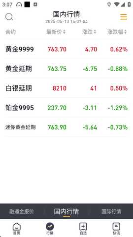 3、在行情板块,用户可以了解到最新价,涨跌情况,国际国内行情。
