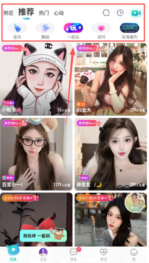 2、在首页,用户可以按分类查看不同类型的直播,比如音乐、游戏等,还可以通过搜索功能查找特定的主播或活动。