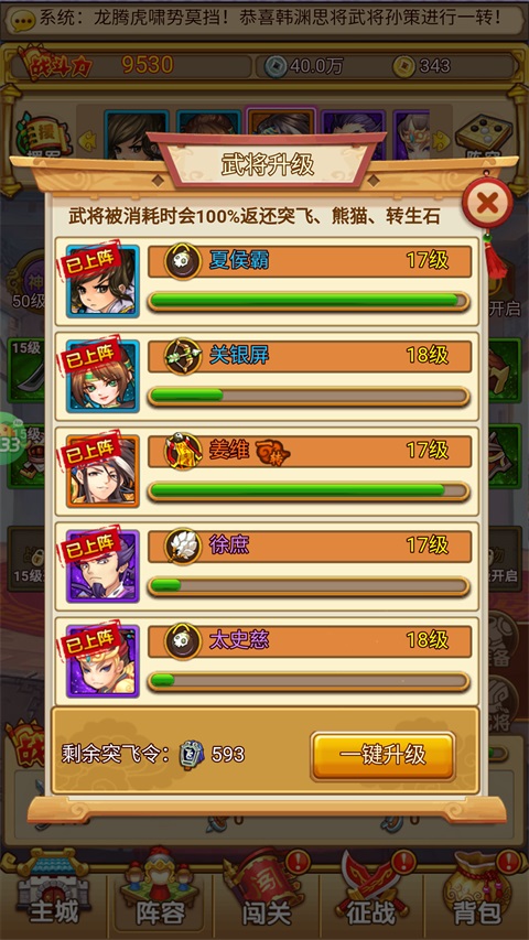 武将等级提升,增强战斗属性。