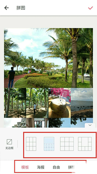 4、设置模板和排列方式之后,点击右上角的“√”这个符号,表示拼图完成。