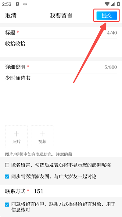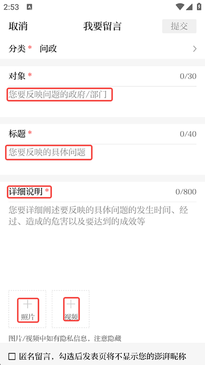 4、选择后输入留言的部门及内容,还可以上传图片和视频;