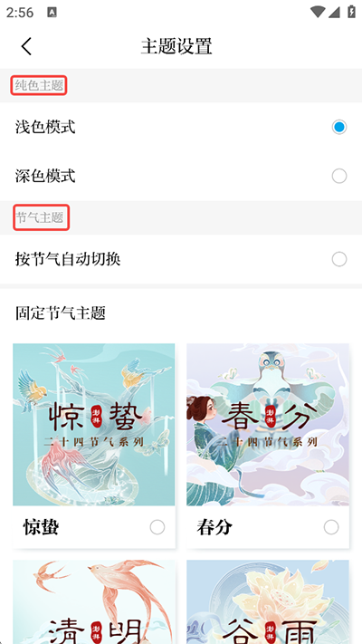 2、进入主题页面后有纯色和节气两大主题可以切换,用户点亮圆形按钮即可完成设置。