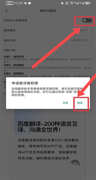 3、开启翻译浮球需申请悬浮窗权限,点击继续按提示设置,成功授权后即可使用跨软件翻译功能。