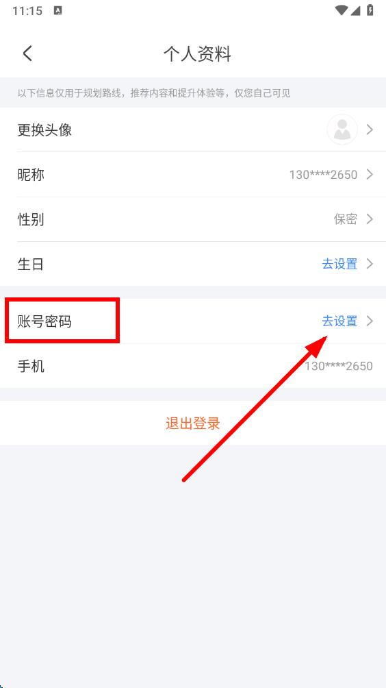 3、在个人资料页面,找到“账号密码”选项,点击其右侧的“去设置”。