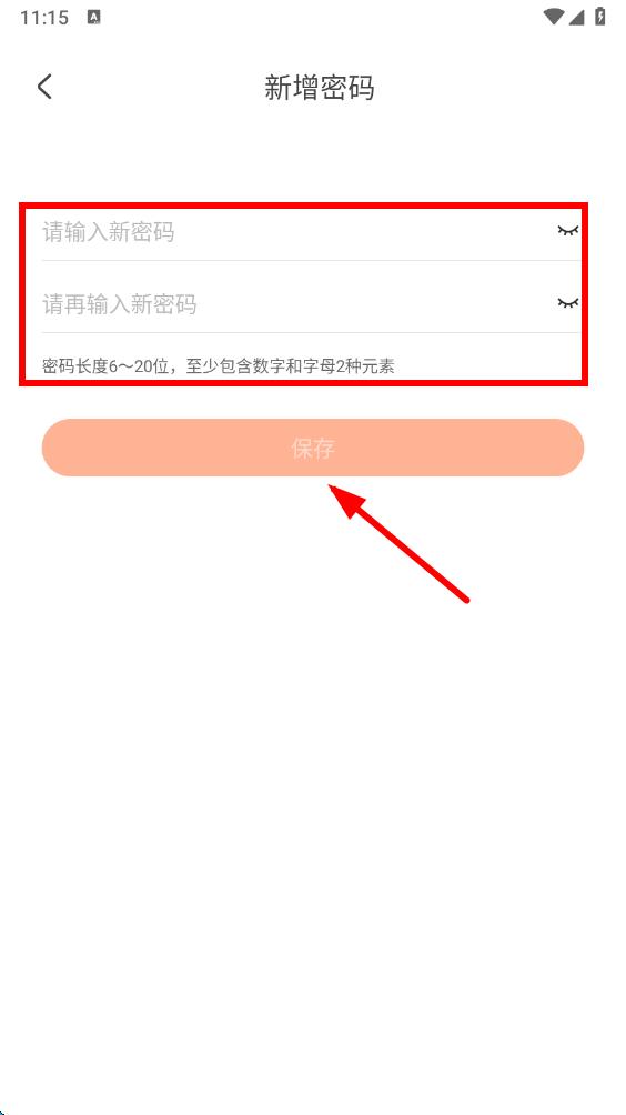 4、进入新增密码页面后,根据提示在输入框中输入新密码,再次确认后点击“保存”按钮,完成账号密码设置。