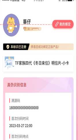 1、进入主页,查看防伪识别信息,点击【我的绑定】