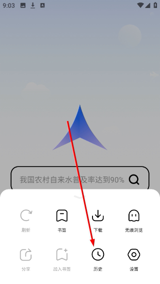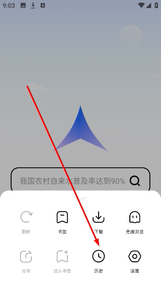 2. 在展开的功能面板中点击“历史”选项,进入浏览记录相关页面。