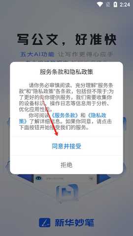2、进入后 阅读并同意新华妙笔app的用户协议