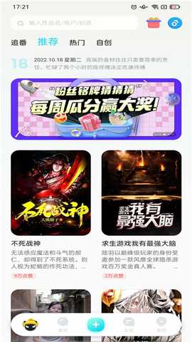 3、现在我们进入软件首页,在这里拥有着发现、互动、我的、推荐、热门、自创选项;