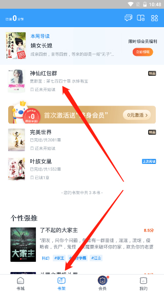 我们在下方找到“书架”,在这里找到我们正在阅读的小说并点击。
