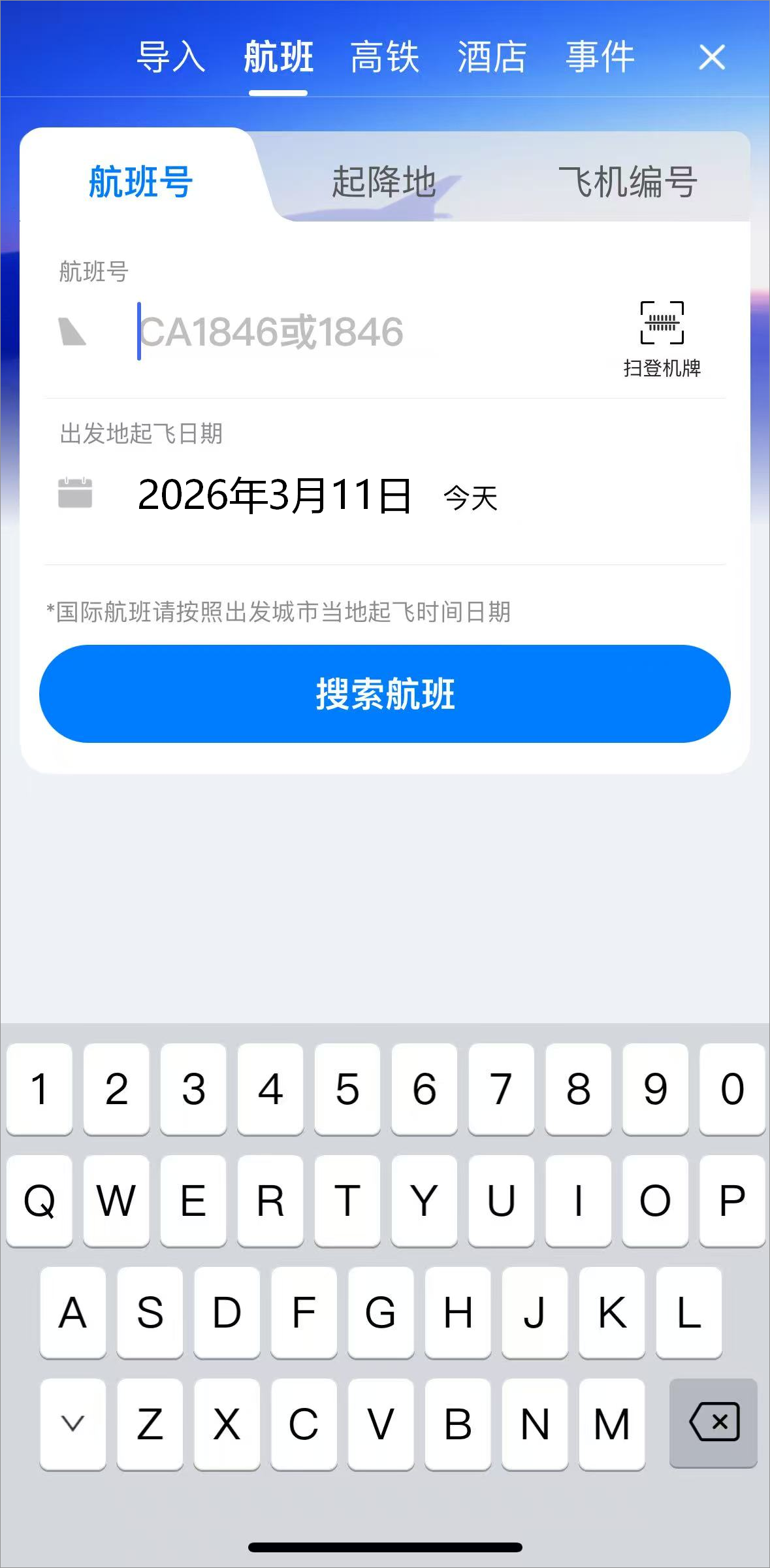 2、可输入航班号,也可直接扫描登机牌,然后点击“搜索航班”。