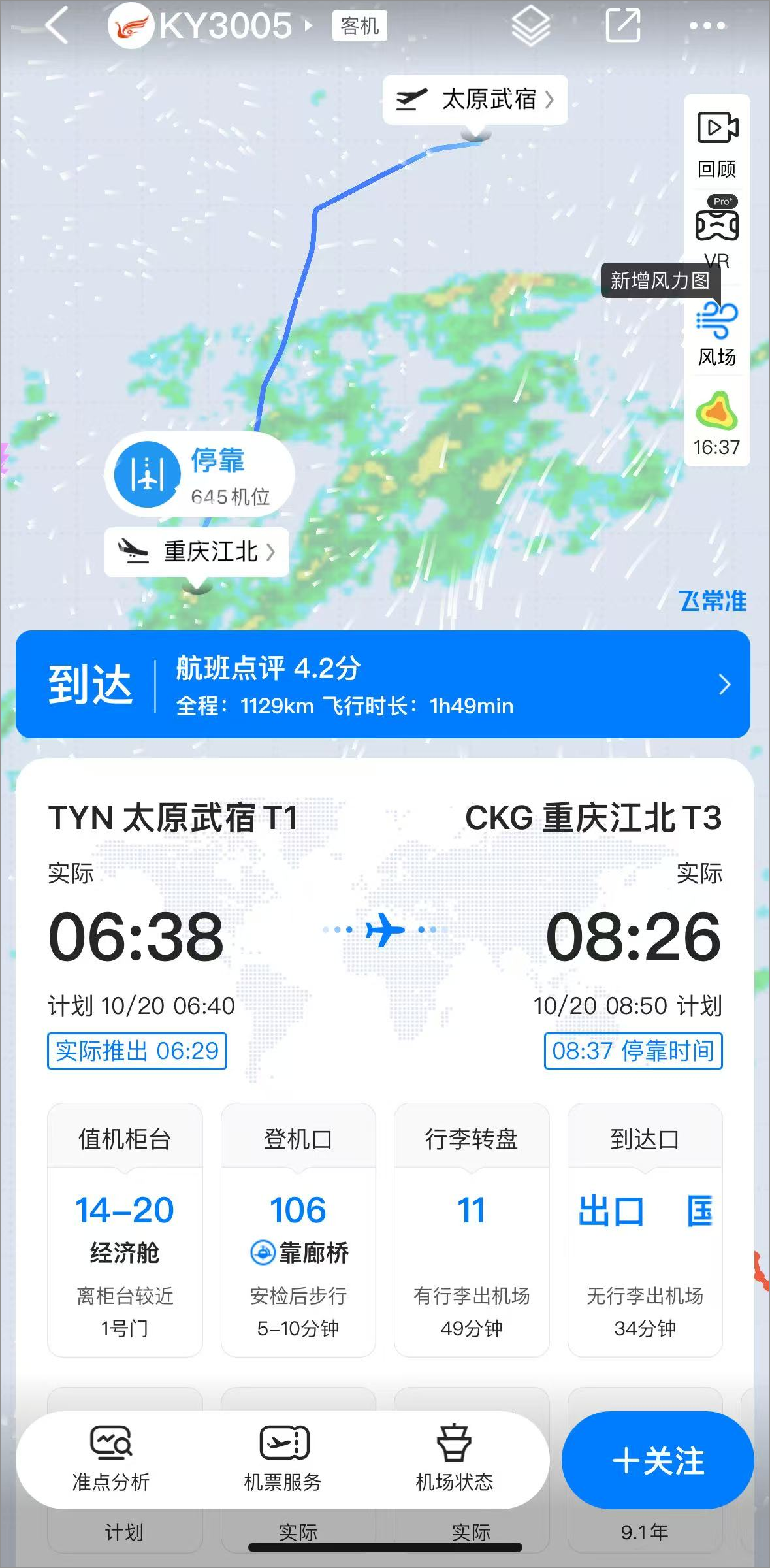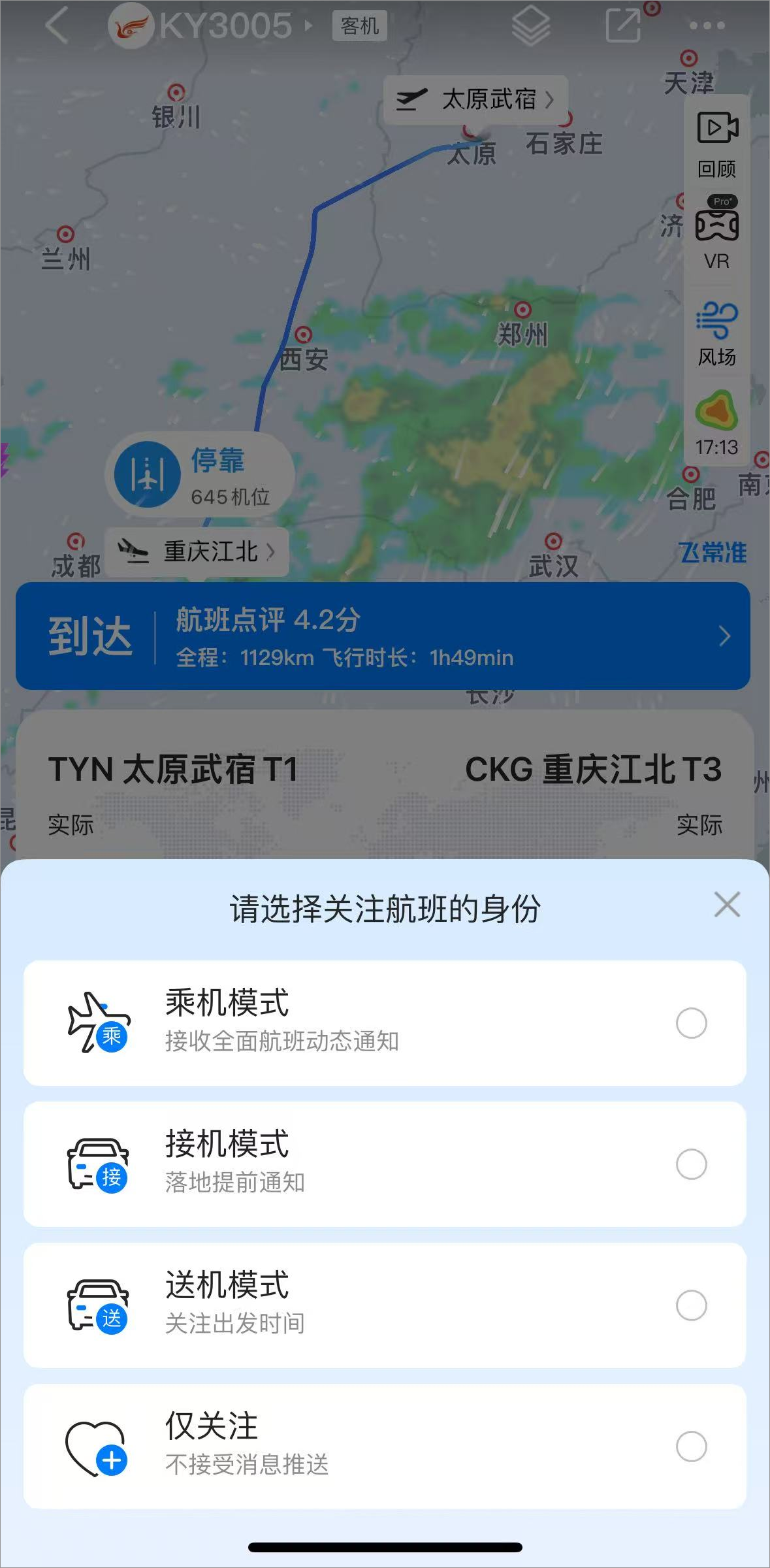 5、点击右下角的“关注”按钮,可选择关注该航班,App将实时推送航班动态通知。