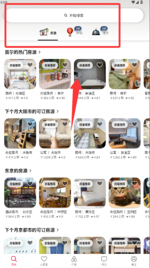 1、安装并启动Airbnb App,完成账号注册及身份认证,在搜索栏填写目的地和日期来筛选房源。