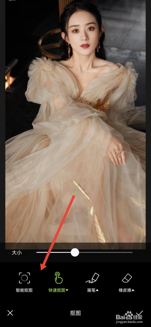 具体操作教程4、在抠图设置的界面里,可以选择智能抠图和快速抠图选项通道,在这里我们点击快速抠图操作选项,并使用鼠标选中图中的背景部分,将需要抠图的人像完美的抠出来,最后点击√选项,保存确认即可。
