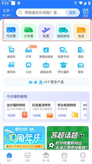 2、在首页选择需要的服务类型,如火车票、汽车票或机票,输入出发地、目的地和出发日期,点击搜索。