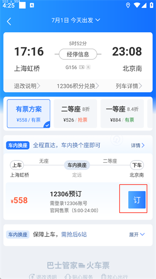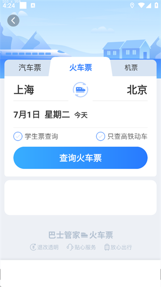 1、便捷的购票体验:巴士管家与12306直连,快速抢购车票,且支持在线补票,避免了因票务问题耽误行程。