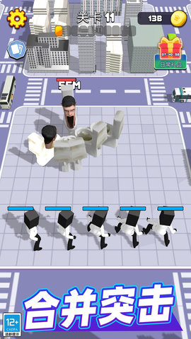 1、玩家需要不断地合并相同的马桶人和摄像人,合成更加高级的怪物,提升战斗力。