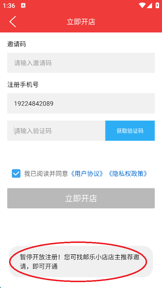 扫描后,会进入注册页面,在此页面输入需要注册的手机号码,点击“获取验证码”,勾选“我已同意……”,最后点击“申请成为店主”,这样就完成了账号的注册流程。