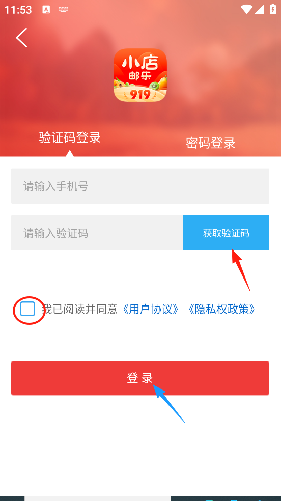 在登录页面输入手机号码,点击“获取验证码”,勾选“我已阅读……”,最后点击“登录”。