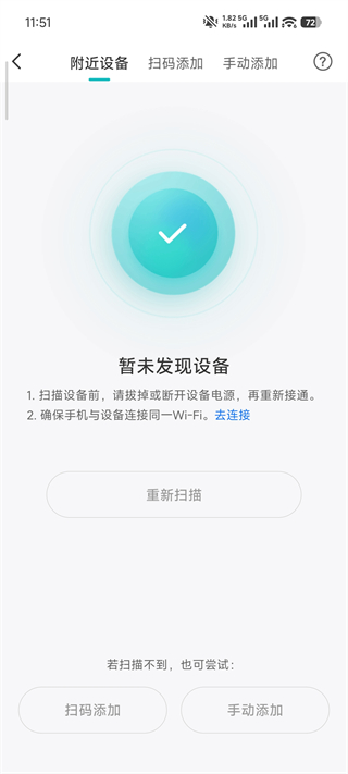 2、App自动扫描附近设备。若提示 “暂未发现设备”,可选择手动添加