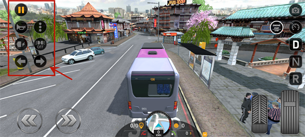 7、进入游戏后就可以操作,小编在图中为各位小伙伴进行了简单标注,其中D为前进挡,也称驱动挡;N为空挡,暂时停车时(如红灯),注意,此挡位表示空挡,为防止车辆在斜坡上溜动,一定要踩着刹车。R为倒车挡,倒车时用。